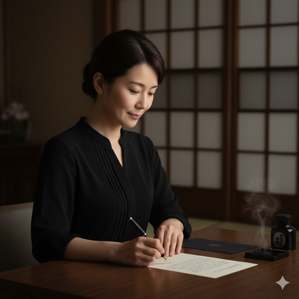 また、使用する筆記用具は、薄墨ではなく濃い黒の筆ペンや万年筆が望ましいとされています。薄墨は、涙で墨が薄まったことを表すものであり、主に訃報の連絡やお香典の表書きに用いるものです。お礼状では、はっきりとした黒字で感謝の気持ちを記します。
